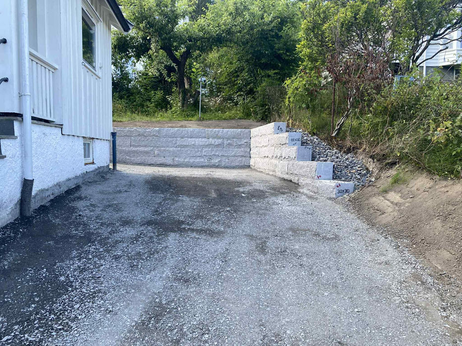 Her har vi hatt gleden av å utføre et helhetlig uteprosjekt med ny innkjøring og parkeringsplass, tilpasset terrenget og huset. Det er bygget solide granittmurer som gir både god støtte, rene linjer og et varig uttrykk. Tomten er samtidig pyntet og opparbeidet for å skape et ryddig, funksjonelt og innbydende uteområde.